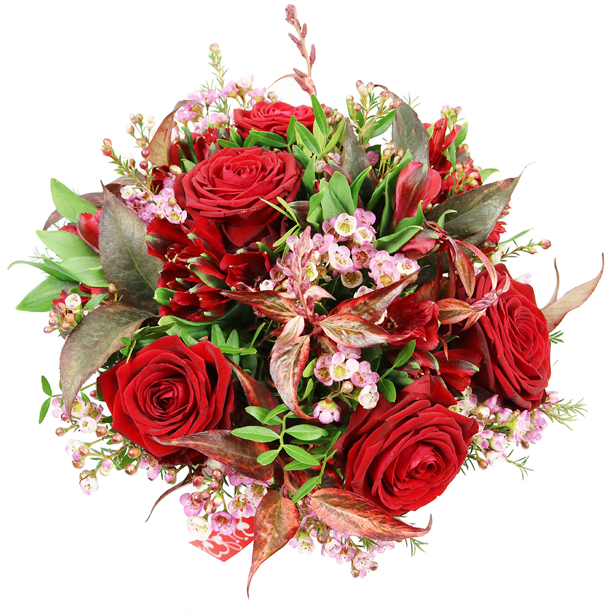 Immerse yourself in the stunning beauty of our unique bouquet, featuring vibrant red roses, elegant red alstroemeria, delicate wax flowers, lush pistacia, and luxurious red greenery. Each bloom is meticulously hand-selected to ensure the highest quality and freshness.