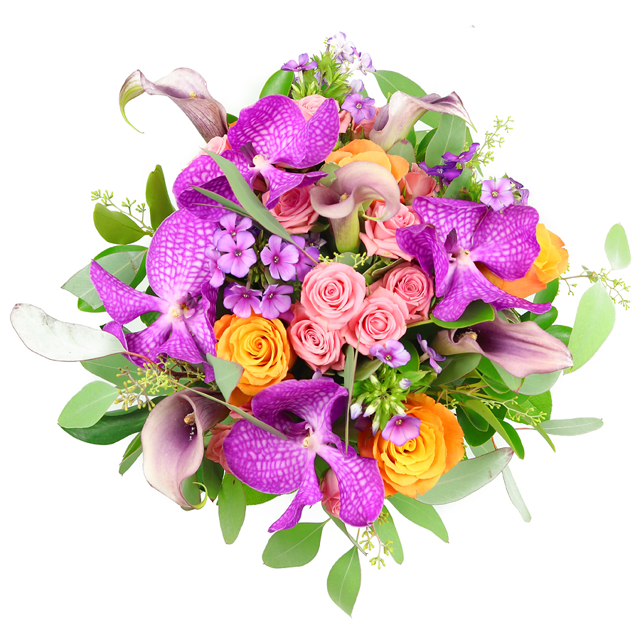 Brighten someone's day with our Bali Dream bouquet from Florist Brent Cross. This vibrant hand-tied arrangement blends exotic purple vanda orchids, elegant pink roses, vivid orange roses and sculptural calla lilies, all framed with lush greenery. Perfect for birthdays, anniversaries, congratulations or simply to say "I'm thinking of you", Bali Dream brings a burst of tropical colour to any home or office.