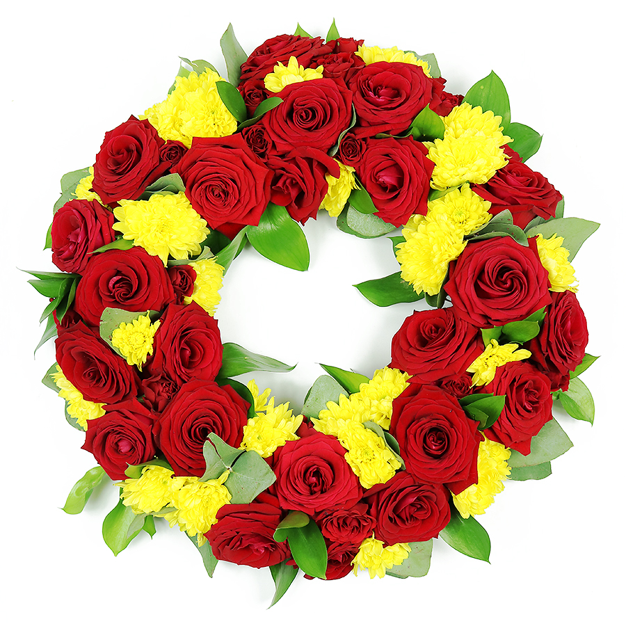 Offer a graceful tribute with our Heartfelt Condolences Wreath from Florist Brent Cross. Expertly handcrafted by our skilled florists in Brent Cross, this circular wreath symbolises eternal life and lasting remembrance. Featuring vibrant yellow chrysanthemums, rich red roses and fresh greenery, it creates a lush, full arrangement that brings warmth and comfort to any funeral or memorial service.