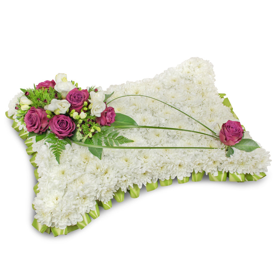 Convey your deepest sympathies with our luxurious pillow-shaped condolence arrangement. This exquisite bouquet features a harmonious blend of white chrysanthemums, purple roses, white freesias, dianthus, and bear grass, symbolizing love and peace. Each bloom is hand-selected to ensure freshness and exceptional quality, providing a meaningful and elegant tribute.