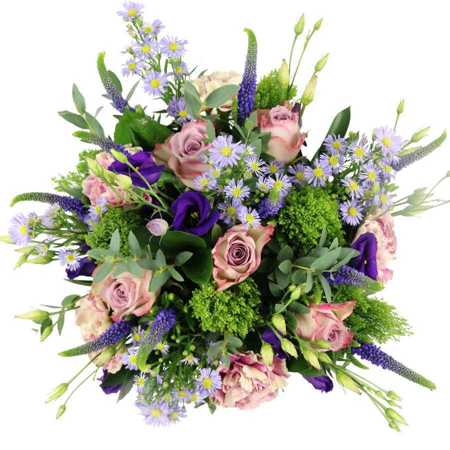 Bring sophistication and charm to any event with our exquisite handcrafted flower bouquet. This unique arrangement combines the timeless elegance of roses, carnations, veronica, asters, and lisianthus with the delicate accents of trachelium, ruscus, and eucalyptus leaves.
